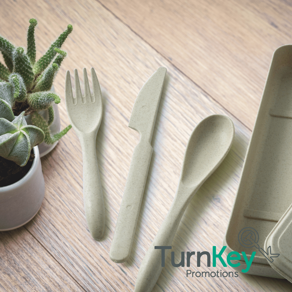 Delish Eco Cutlery Set Includes full size fork, knife and spoon in a push-lid container. Made from a 50/50 blend of wheat fibre and BPA free polypropylene. Replaces: Disposable plastic cutlery